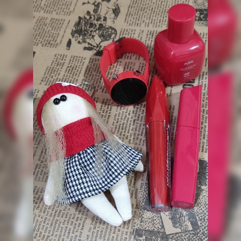 پک کادویی همراه با جعبه ساعت بند پیو قرمز ادکلن اسکلاره و یا آلن با جلد قرمز رژلب مایع قرمز برند رندوم ریمل پوکه قرمز برند رندوم عروسک روسی با لباس قرمز جعبه پوشال #کادو #کادوتولد #هدیه #هدیه_تولد